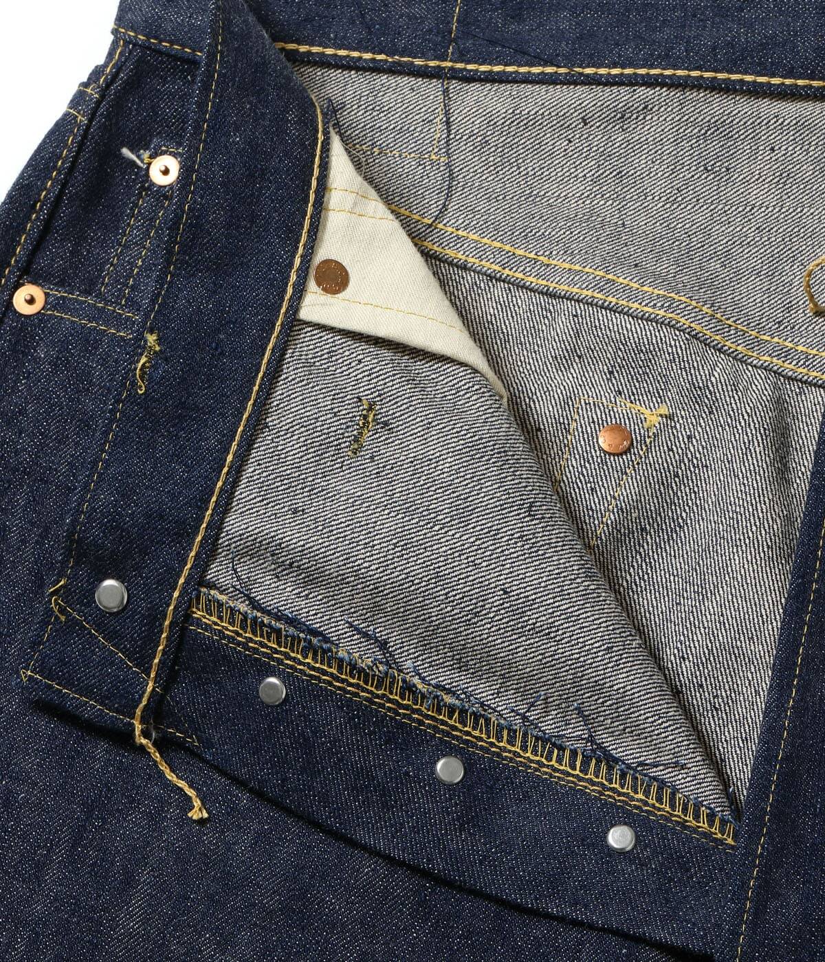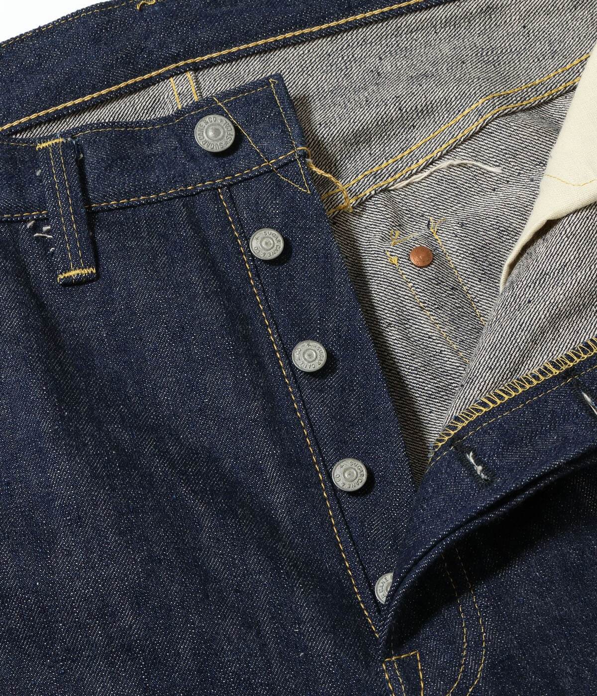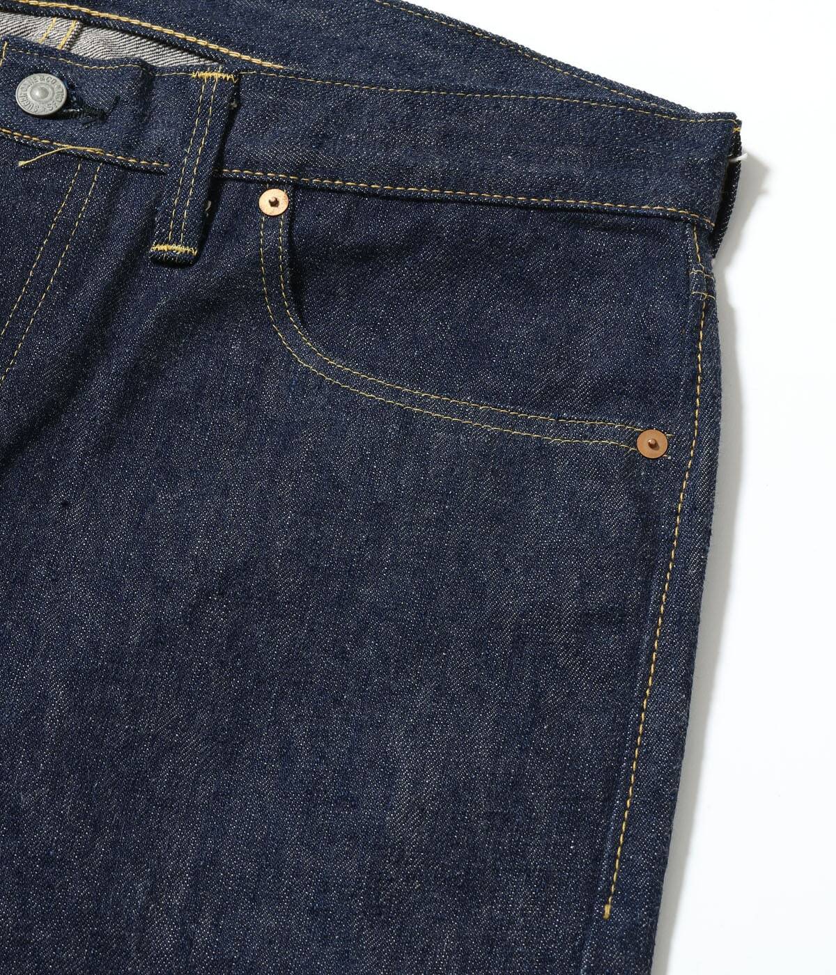 品番の頭に「S」が付いているにもかかわらず、コインポケットにリベットが打ち込まれた1945年後期頃のウエストオーバーオールズ。ボタンはトップ、フライ共にロゴ入りの鉄製タックボタンで、リベットは無地の鉄リベットを使用している。もとにしたヴィンテージはノンウォッシュのミントコンディション。品番の後ろに「A」がスタンプされた非常に希少な個体で、「A」の付くヴィンテージはこれまで世界でも2本しか確認されていない。生地はムラが強く荒々しい14オンスのデニム。持ち出しや向布などの地の目の向きがイレギュラーで、縫製もコインポケットの先端のステッチが少しこぼれてしまっているなど、「大戦モデル」らしい粗野な作りが特徴。