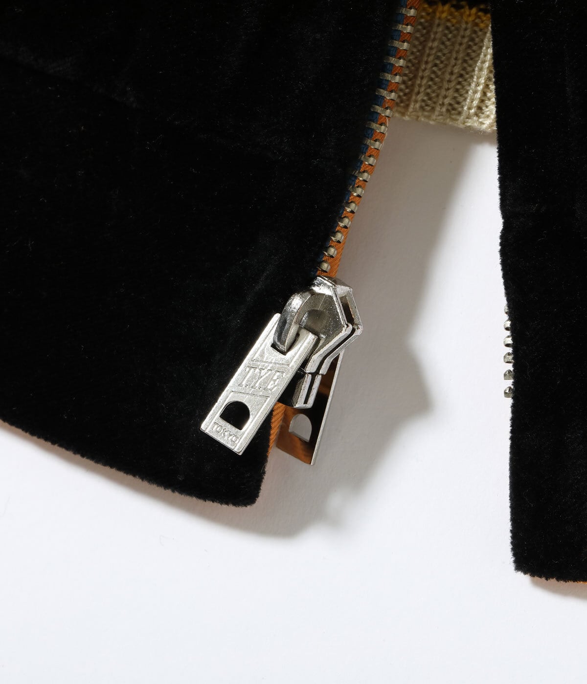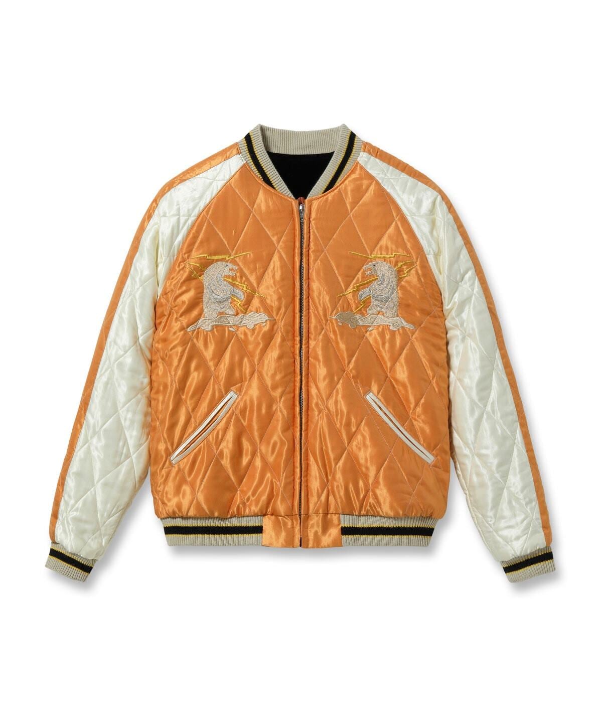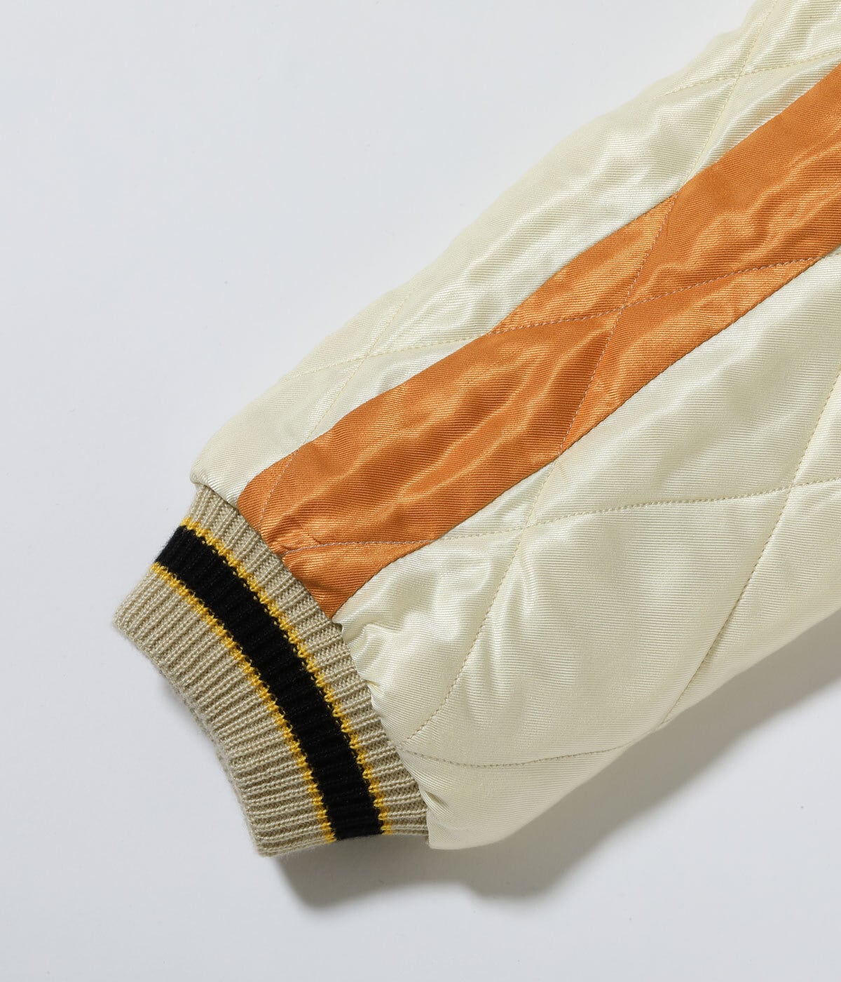 初期のスーベニアジャケットはアセテート生地のリバーシブル仕様が多いが、当時のバリエーションとして毛羽感のある別珍(べっちん)生地を使ったモデルも存在する。中綿を入れることで防寒性を高め、リバーシブル面のアセテートには中綿を押さえるためのキルティングが施されていた。