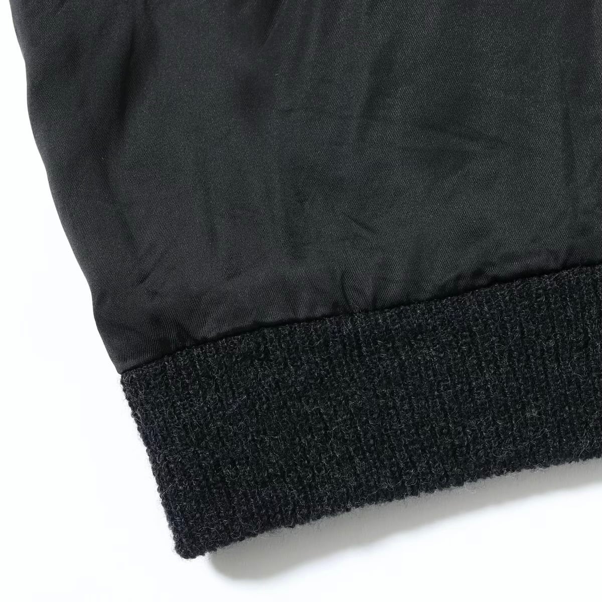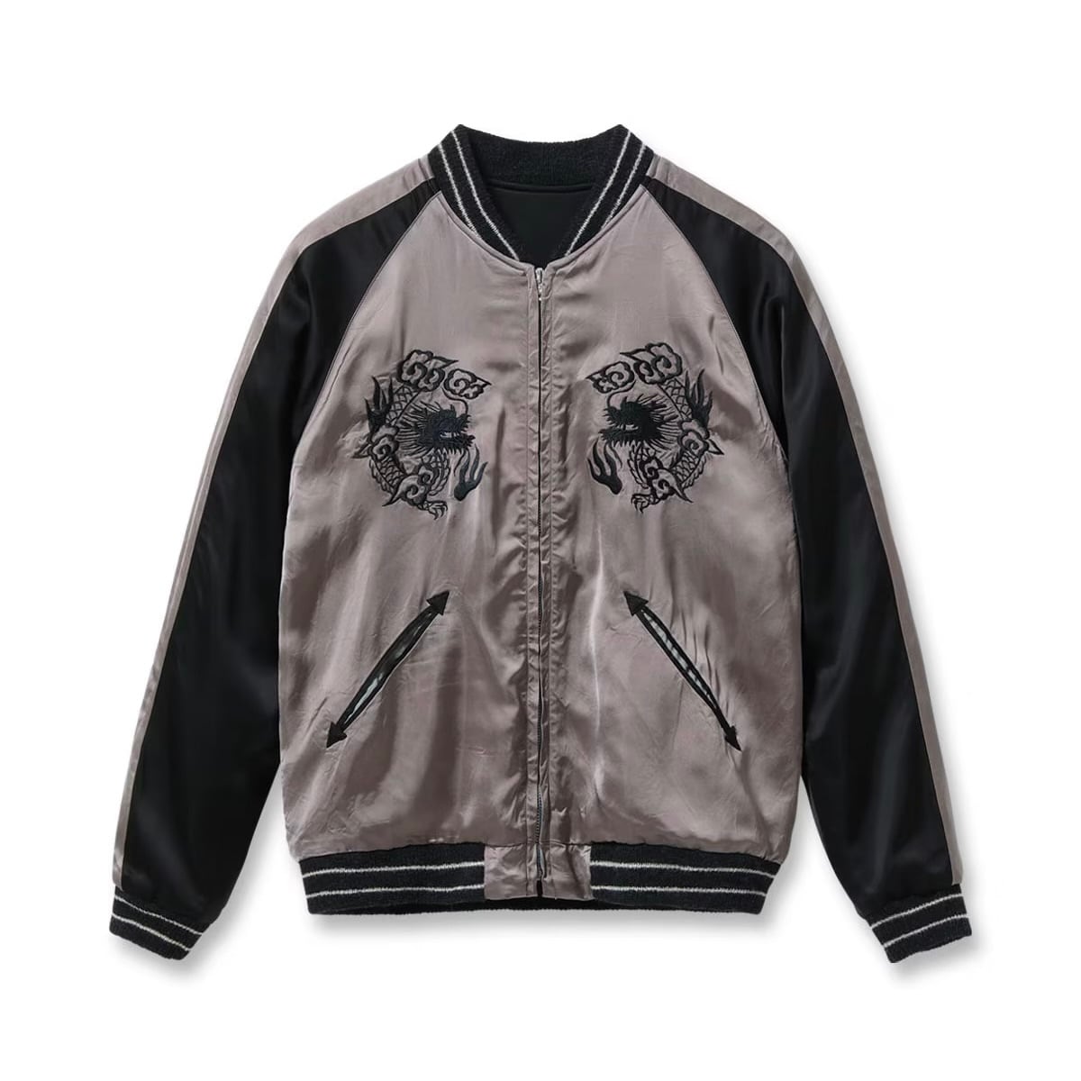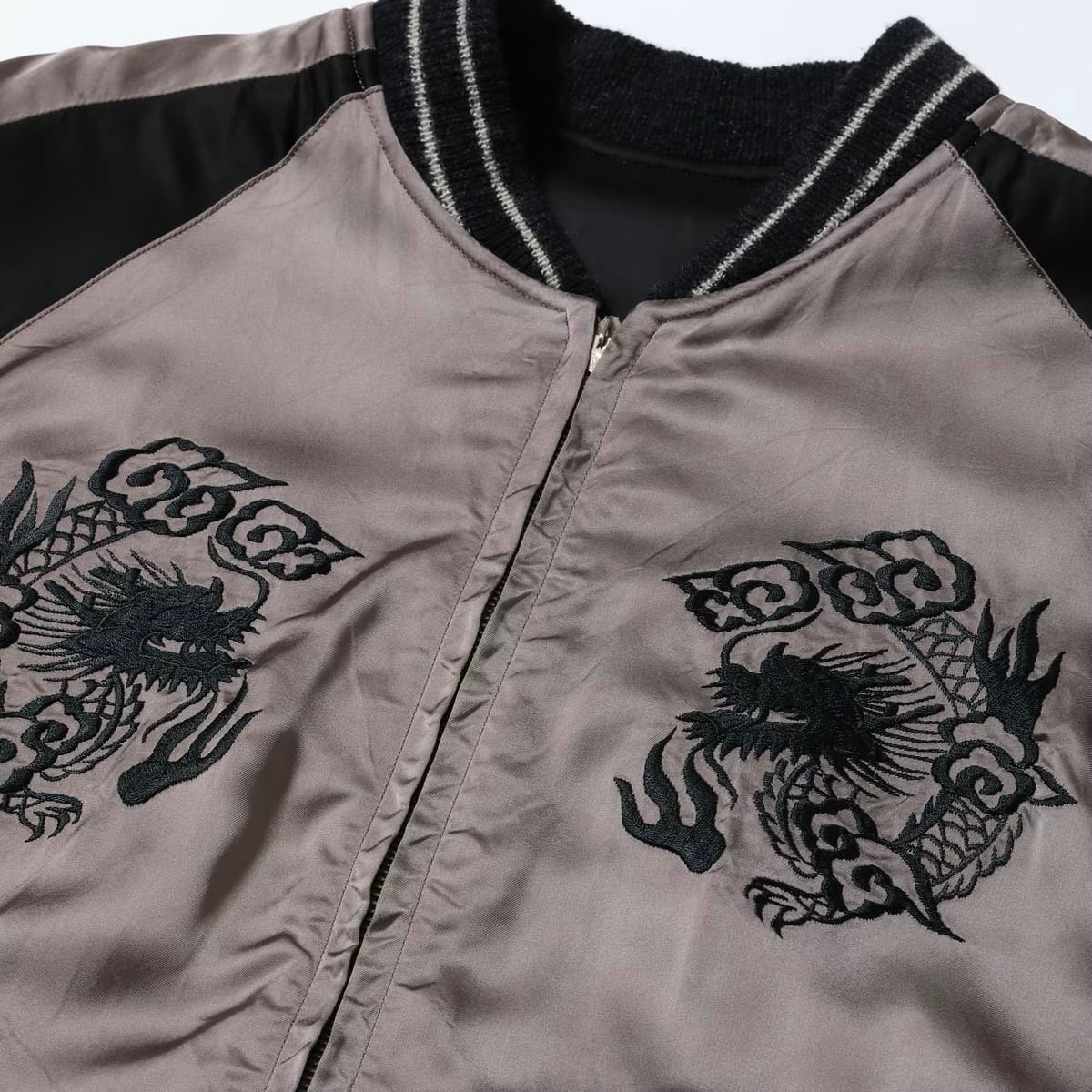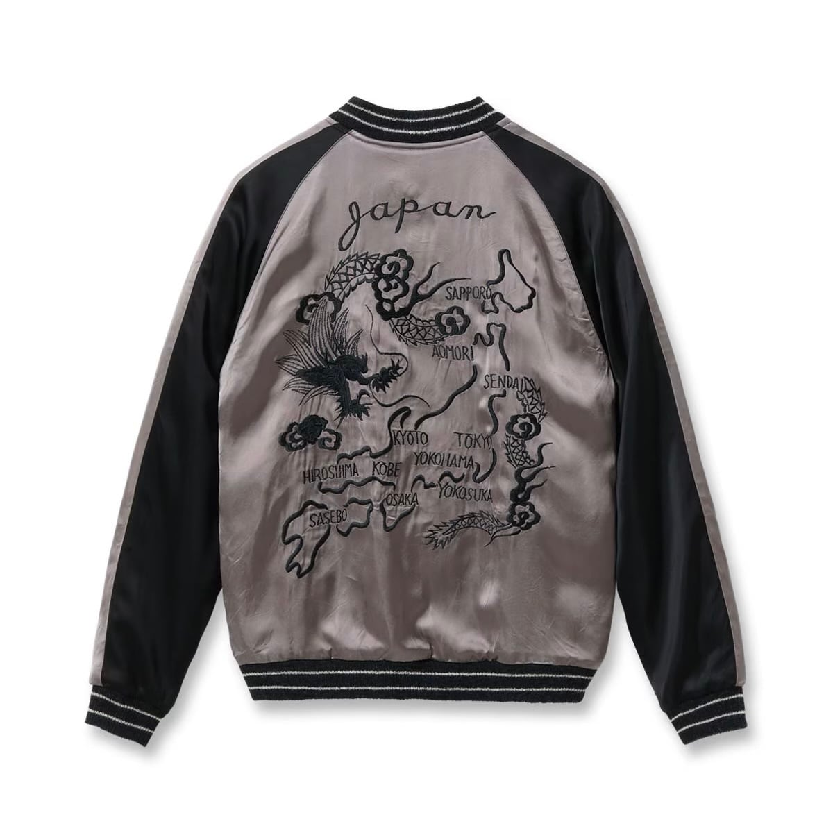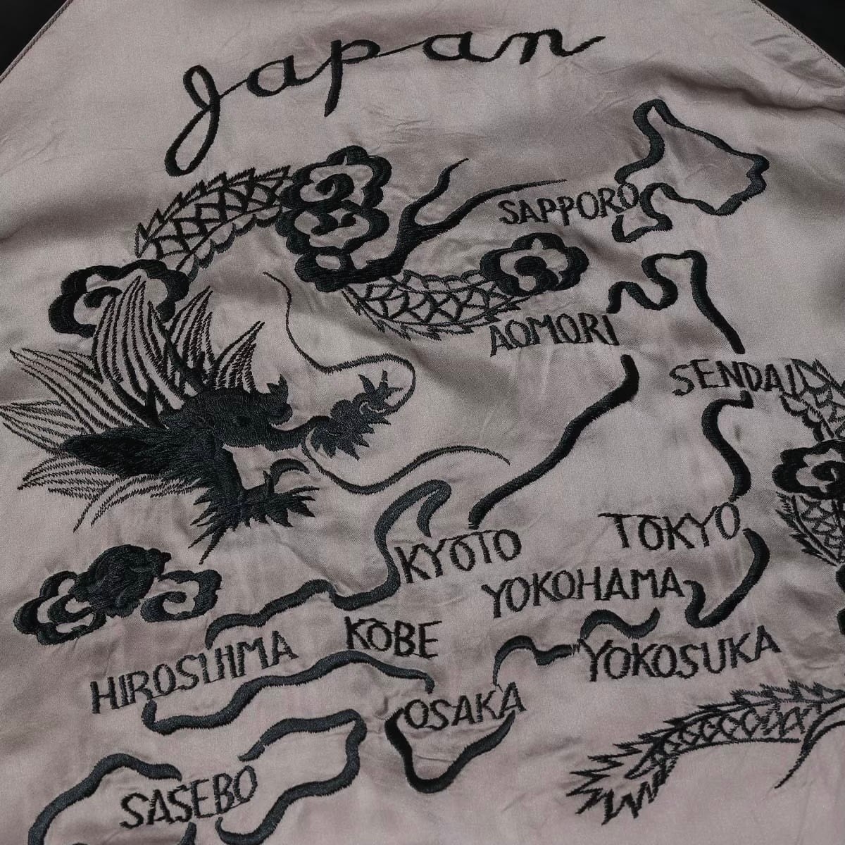 対してリバーシブル面はジャパンマップ柄。褪色したヴィンテージの魅力的な色味から着想を得たパープルグレーのボディに、黒一色で日本地図と龍を刺繍している。ヴィンテージは多色であったが横振り刺繍の立体感により単色でも絵柄の迫力が損なわれることはなく、身頃のグレーより袖下のブラックの方が濃い「逆配色」のボディに載せることで上品に。1940年代当時も同じ刺繍型で配色違いのスカジャンは作られており、ヴィンテージの刺繍の魅力とオリジナルの配色の魅力を兼ね備えたスペシャルな一着に仕上がっている。