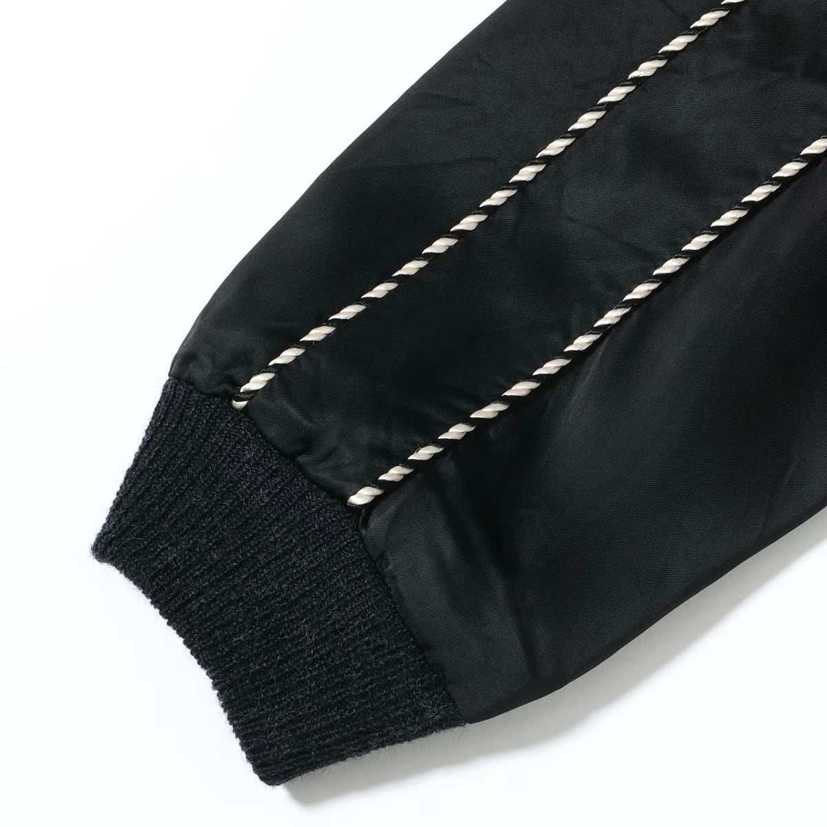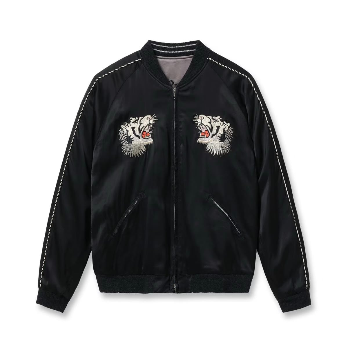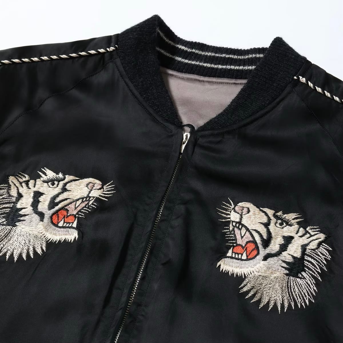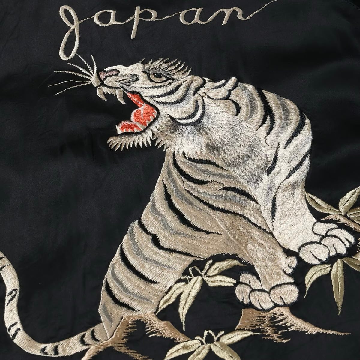 こちらはテーラー東洋独自のアレンジを加えたモデルで、表面は黒一色のボディに白虎が咆哮する絵柄。元にしたヴィンテージはカラフルな配色であったが、本作はモノトーンに仕上げた。刺繍は白の色糸を基調としつつ、箇所により針足の方向を変えて筋骨隆々とした虎の体躯を表現。さらに部分的にグレーや黒を差して立体感を強調している。下部の笹の葉や岩肌は一見すると虎と同色に見えるが、実はそれぞれ色味を変えており、計7種類の色糸を使い分けた贅沢な刺繍が特徴。
