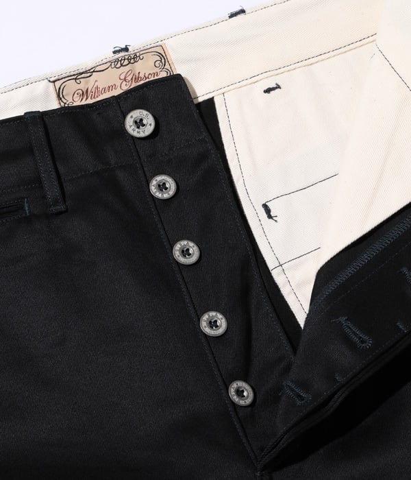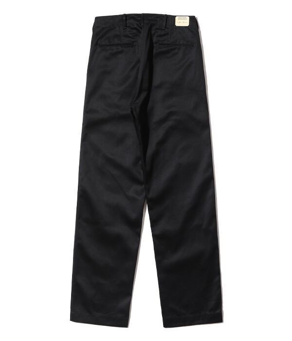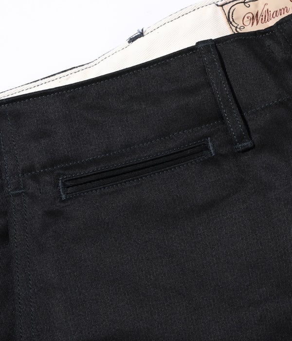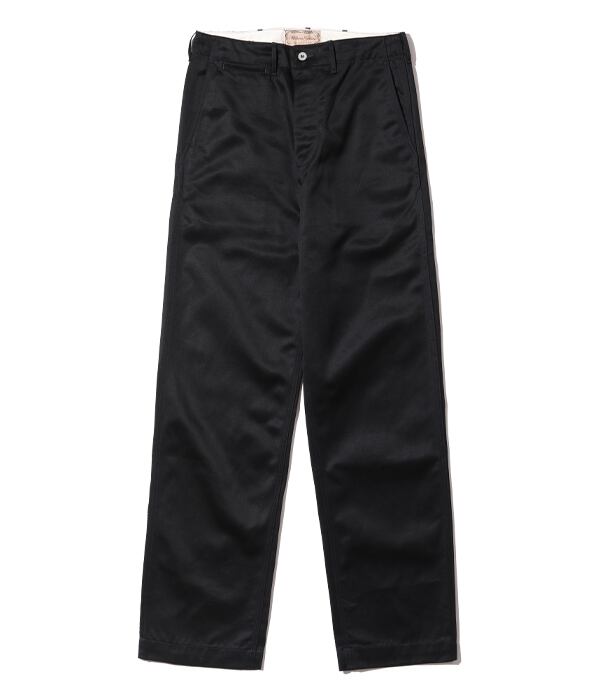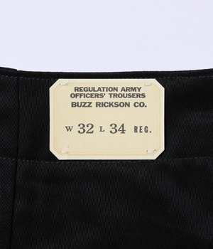 バズリクソンズが展開するミリタリーチノのブラックモデル。脇・内股・尻ぐりが2本針巻き縫い仕様になっている。1940年代当時はこの仕様で縫製できるミシンの台数が限られていたため、ヴィンテージでも割り縫い仕様のチノパンに比べて数が少ない。フロントはU.S. ARMYの刻印が入ったメタルボタン、ポケット口は高度な縫製技術を要する両玉縁仕様。高密度の生地には特有の光沢感があり、太めのシルエットが古き良き時代のジャケットと好相性。